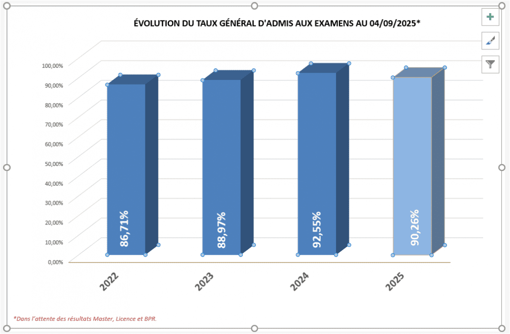 - Session 2025 : 90,26% au 04/09/2025 d’admis aux examens 2025. Dans l’attente des résultats Master, Licence et BPR.